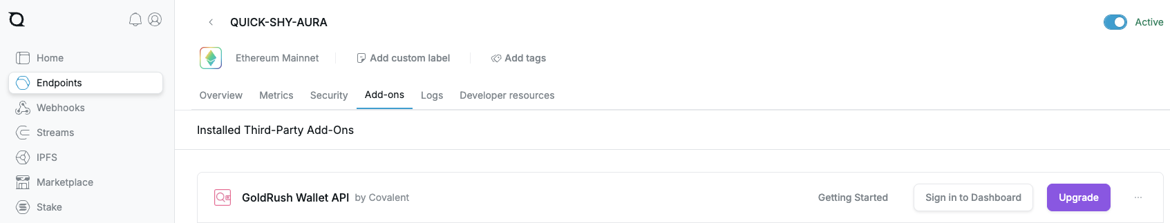 - Quicknode lists every third-party add-on that is available for your endpoint. You should see the specific GoldRush API add-on listed under Installed Third-Party Add-Ons.